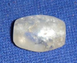 | Description / विवरण | Dhol shaped stone bead with smooth surfaces and a perforated hole at the centre. It is transparent in colour and cracked from inside. |