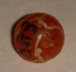 | Description / विवरण | Shining stone bead spherical in shape with white lines on orange surface, it is partly broken. |