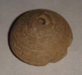 | Description / विवरण | Plain terracotta bead, betel nut in shape with perforated off. The body part is partly flaked off. |