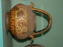 | Description / विवरण | Kamandal water pot , made up of camel hide, lacquered and ornamented. |