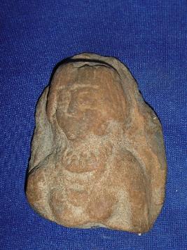 | Description / विवरण | Fragment of a terracotta female figure in low relief. The head is tilted towards her right and the hairstyle seems to have western influence. Circular earrings and three strands of necklaces are visible. The portion below the bosom is broken. The features are rubbed out. |