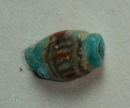 | Description / विवरण | Tiny, multi colored Glass bead, cylindrical body, having flat surface and circular ends with perforated hole at the centre. At the middle, horizontal bands are seen followed by vertical lines in between them. |