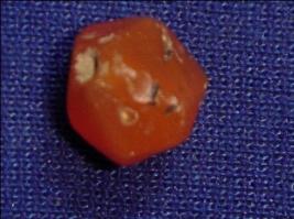 | Description / विवरण | Carnelian stone bead, spherical in shape orange in colour with white lines. A perforated hole is visible in the centre. |