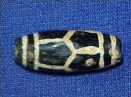 | Description / विवरण | Stone bead, spindle shaped with a perforated hole in the centre. It is originally black in colour with white lines. |