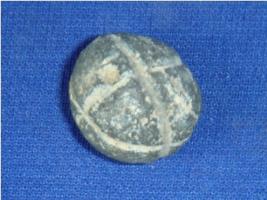 | Description / विवरण | Tiny terracotta sling ball, irregular in shape, having rough surface with incised lines intersecting each other at the middle.. |
