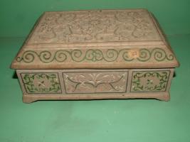 | Description / विवरण | Box, flat and oblong sand stone with inlaid mosaic work on the sides lidis carved with floral designs in relief standing on four legs. |