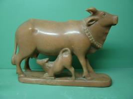 | Description / विवरण | Cow with claf, standing, pink marble, carved. |