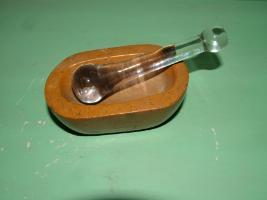 | Description / विवरण | Mortar with a glass pestle, oval, yellow, lime-stone, carved. |