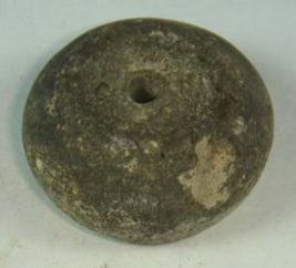 | Description / विवरण | Flat and circular perforated terracotta bead, with oval rim. The lower portion is chopped off. |