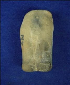 | Description / विवरण | Fragment of small simple terracotta human figurine in low relief. It is the lower portion, below the waist unto the feet, in standing position. The backside is flat. |