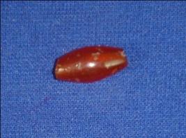 | Description / विवरण | Carnelian stone bead, spindle shaped with a perforated hole in the centre. |