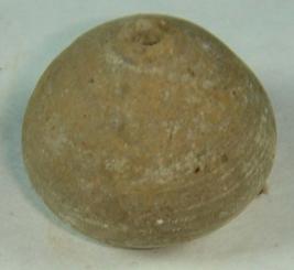 | Description / विवरण | Perforated terracotta bead having betel nut body without any decoration. The base has a circular ridge embossed around perforation. |