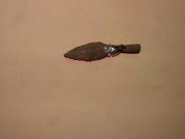 | Description / विवरण | An iron arrow head, small, a petal shaped part, painted top and round back where the wooden handle was fitted. |