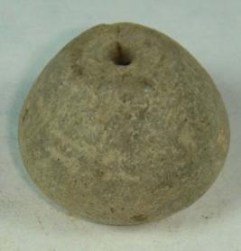 | Description / विवरण | Perforated terracotta bead with betel nut body, without any decoration. A part of the base is having slight depression in circular fashion. The body is partially chopped off. |