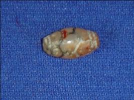 | Description / विवरण | Spindle shaped carnelian stone bead. with a perforated hole in the centre. It is originally light orange in colour with black lines. |