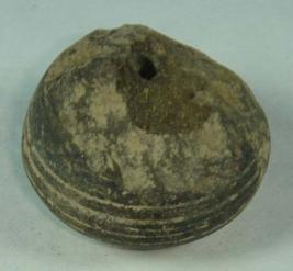 | Description / विवरण | Perforated terracotta bead having betel nut body without any decoration. The upper portion is chopped off while the body and base has close striation marks. The base has a depression in circular fashion around the perforation. |