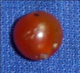 | Description / विवरण | Small plain carnelian stone in spherical shape. It has a small surface and a perforated hole in the centre. |
