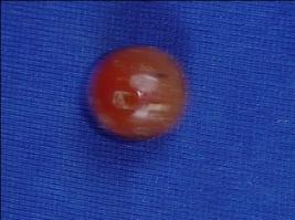 | Description / विवरण | Stone bead, circular in shape, scarlet in colour with perforated hole at the centre. |