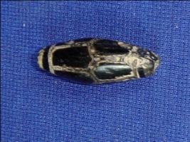 | Description / विवरण | Stone bead, spindle shaped with white line. There is a perforation in the centre. |
