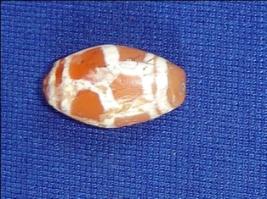 | Description / विवरण | Stone bead, cylindrical in shape, with a perforated hole in the centre. There are some geometrical designs with white colour on the surface. |
