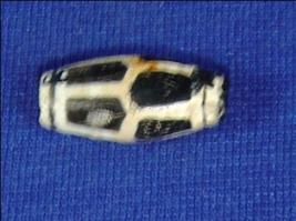 | Description / विवरण | Spindle shaped black stone bead with white lines. There is a perforated hole. |