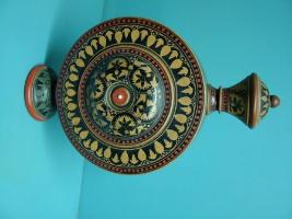 | Description / विवरण | Water bottle, surahi with etched birds on the bowl. Wood, incised lacquer. |