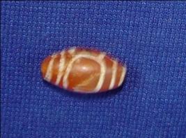 | Description / विवरण | Stone bead spindle shaped, orange in colour with white lines. There is a perforated hole. |