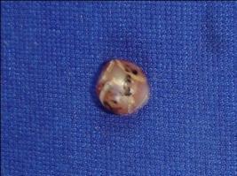 | Description / विवरण | Stone bead, round in shape, orange in colour with white lines. |