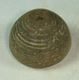 | Description / विवरण | Perforated terracotta bead, betel nut in shape, rough surface with striation marks. |