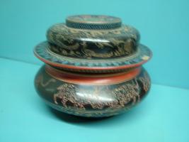 | Description / विवरण | Box with cover, incised lacquer work, yellow and blue on black ground with etched figures of birds and animals. |