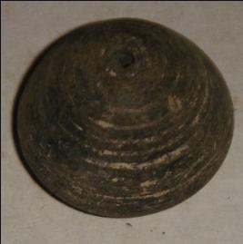 | Description / विवरण | Perforated terracotta bead, with slightly oval base, with depression in circular fashion around perforation. |