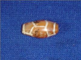 | Description / विवरण | Spindle shaped carnelian stone bead orange in colour with white lines. A perforated hole is seen in the centre. |