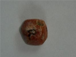 | Description / विवरण | Multifaceted orange stone bead with rough surfaces. It has a perforated hole in the centre. |