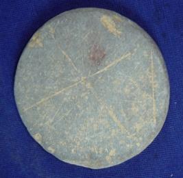 | Description / विवरण | Circular stone disc with smooth flat circular ends, with the surfaces having cross line, edged one slightly flaked off. |