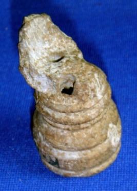 | Description / विवरण | Fragment of coarse terracotta smoking pipe with circular designs all over the body. The top of it has incised holes and base has a perforated hole. |