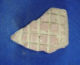 | Description / विवरण | Fragment of a terracotta skin rubber with incised block designs on one face while the other face is plain. |