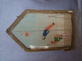 | Description / विवरण | The model made on a paper with watercolor and framed in a wooden box with a glass in front shows a net climbing a pole and another doing aerobics on a rope tied to four poles at two sides. A man in green tunic is playing a drum behind him. The Net hanging from the rope does aerobics when moved. |