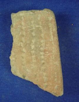 | Description / विवरण | Fragment of skin rubber having incised block designs at one surface and incised dots in line on the other surface. It was probably used as a scrubber. |