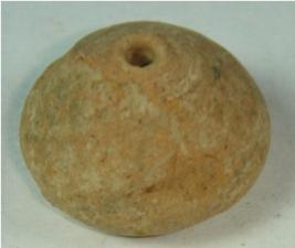 | Description / विवरण | Perforated terracotta bead, betel nut in shape the body part is flaked off. Clay incrustation all over |