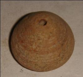| Description / विवरण | Terracotta bead, betel nut in shape, perforated and depression at the base and has smooth surface. It also has close incised lines all over. |