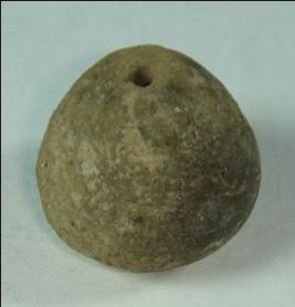 | Description / विवरण | Perforated terracotta bead betel nut in shape, the body is rubbed off. Clay incrustation all over |