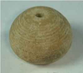 | Description / विवरण | Perforated terracotta bead, betel nut in shape, the base is partly flaked off. |