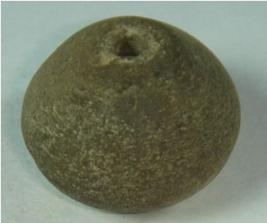 | Description / विवरण | Perforated terracotta bead, betel nut in shape, the body is slightly flaked off. |