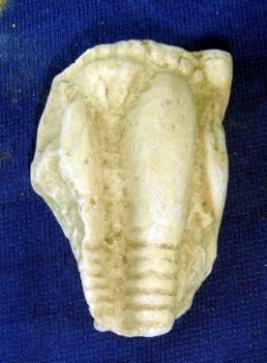 | Description / विवरण | Handle of a jar of lime stone, slightly concave in shape on the upper surface of which lower part of a nude female figurine is depicted. The feet are missing and right leg is partially broken. Part of waist band designed with incised lines is visible with anklets. |