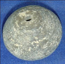 | Description / विवरण | Terracotta bead, betel nut in shape with broad flat base, with a depression at the centre. A perforated hole is visible at the centre, probably to put it in a string, close striation marks are present on its body. |