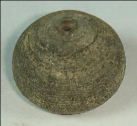 | Description / विवरण | Perforated terracotta bead, betel nut in shape, having striation marks on body and concentric circle at base, with slight depression at base. |
