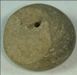 | Description / विवरण | Small terracotta bead with betel nut body and flat base. It has perforated hole in centre and surrounded with striation marks. It is semi fine and has a depression at base. The body is half chipped off. |