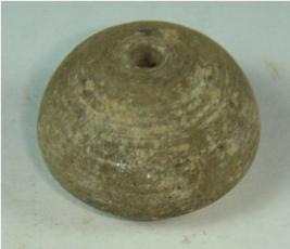 | Description / विवरण | Perforation terracotta bead, ill fired, betel nut in shape, having striation marks all over body and concentric circle circles at base. |