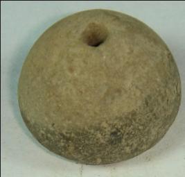 | Description / विवरण | Small terracotta bead with betel nut body and flat base. It has perforated hole in centre and surrounded with striation marks. It is semi fine and has a depression at base. |