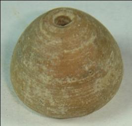 | Description / विवरण | Perforated terracotta bead, ill fired, betel nut in shape having striation marks all over body, and concentric circles at base near the depression. |